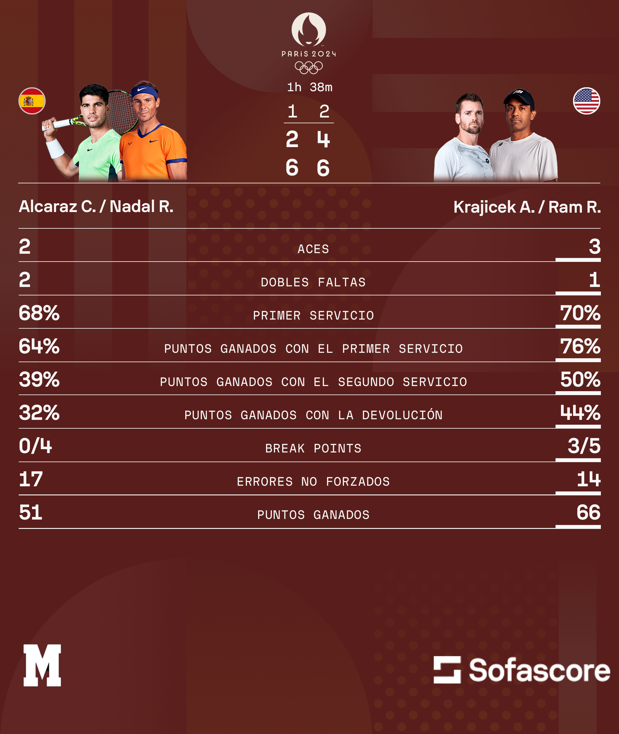La dupla española vio cortado el sueño de darle al manacorí la anhelada presea olímpica en su lugar preferido, y donde puso su nombre con letras de oro en Roland Garros. Pero esto no sucederá en París de 2024, puesto que quedaron fuera en los cuartos de final ante Estados Unidos.