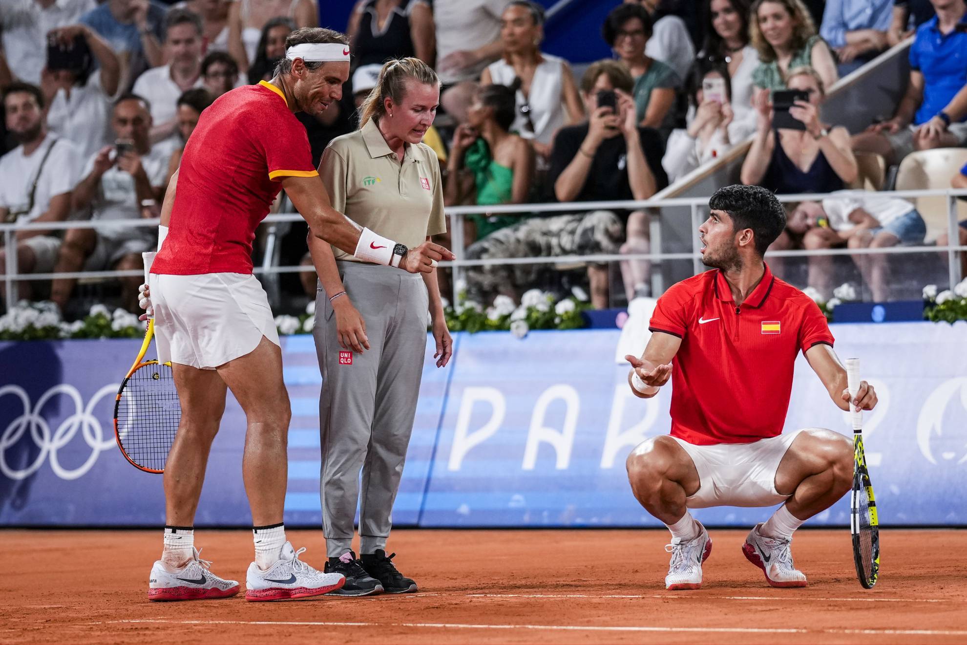 Los españoles pensaron que la pelota había caído fuera y se agacharon para acercarse a la arcilla mientras discutían su caso con la juez de silla francesa Morgane Lara. Pero la decisión no cambió.