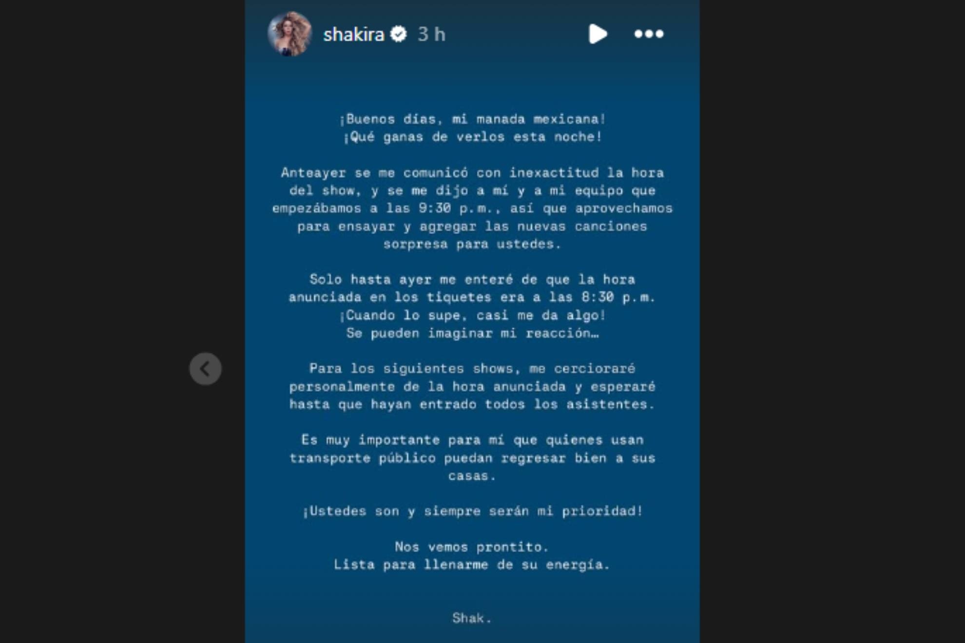 Shakira ha cautivado a miles de fans que se han dado cita en cada uno de sus conciertos por México con la gira "Las mujeres ya no lloran". Sin embargo, en su concierto del miércoles 19 de marzo, la cantante salió al escenario en punto de las 9:30PM cuando la hora pactada estaba prevista a las 8:30PM. Sin embargo, fue la propia estrella colombiana quien ha aclarado la situación mediante un mensaje en su red social Instagram.
