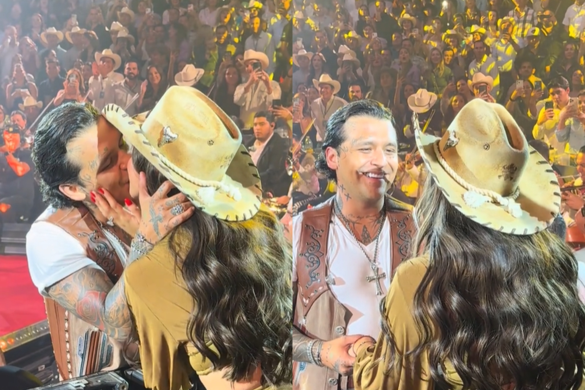 Ante esto, el sonorense se acercó a la cantante para que cantara junto a él y le acercó el micrófono para interpretar parte de sus versos y no solo eso, sino que también gritaron a los cuatro vientos lo felices que están y se plantaron tremendo beso.