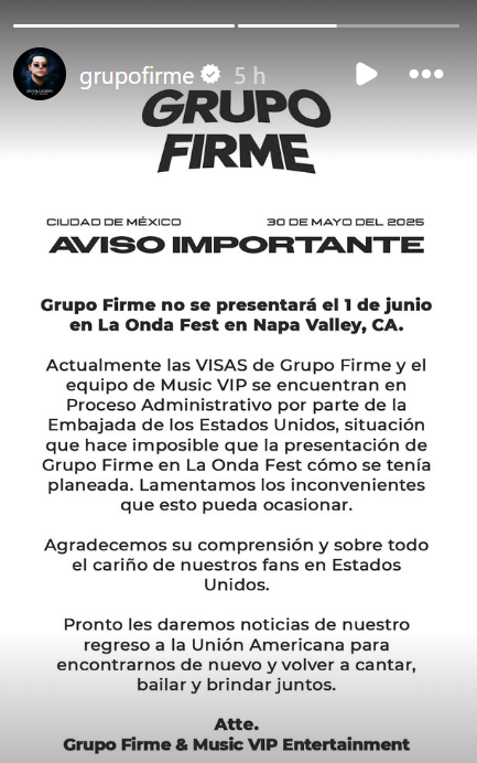 "Grupo Firme no se presentará el 1 de junio en La Onda Fest en Napa Valley, CA. Actualmente las VISAS de Grupo Firme y el equipo de Music VIP se encuentran en Proceso Administrativo por parte de la Embajada de los Estados Unidos, situación que hace imposible que la presentación de Grupo Firme en La Onda Fest cómo se tenía planeada. Lamentamos los inconvenientes que esto pueda ocasionar. Agradecemos su comprensión y sobre todo el cariño de nuestros fans en Estados Unidos. Pronto les daremos noticias de nuestro regreso a la Unión Americana para encontrarnos de nuevo y volver a cantar, bailar y brindar juntos", indicaron.